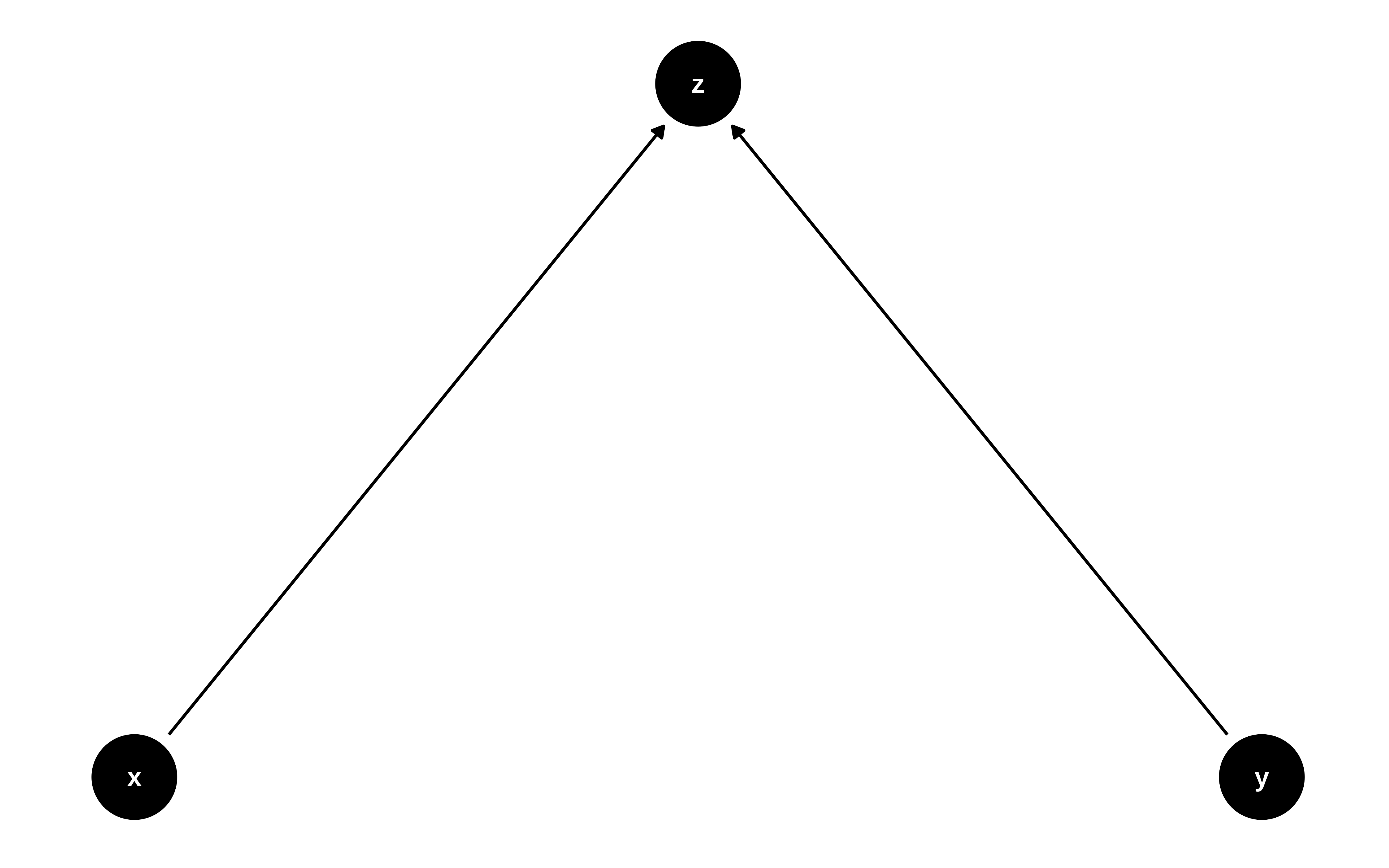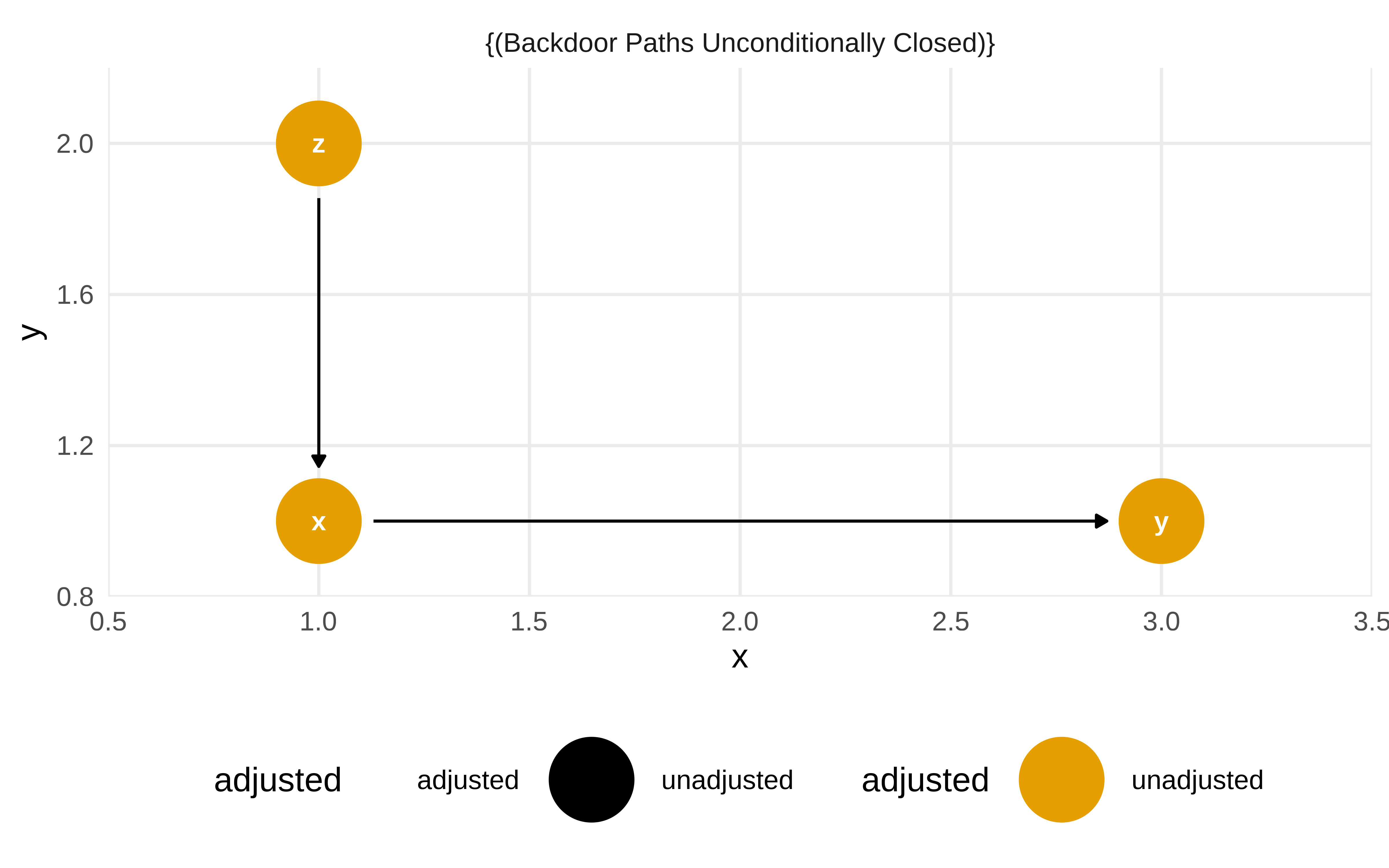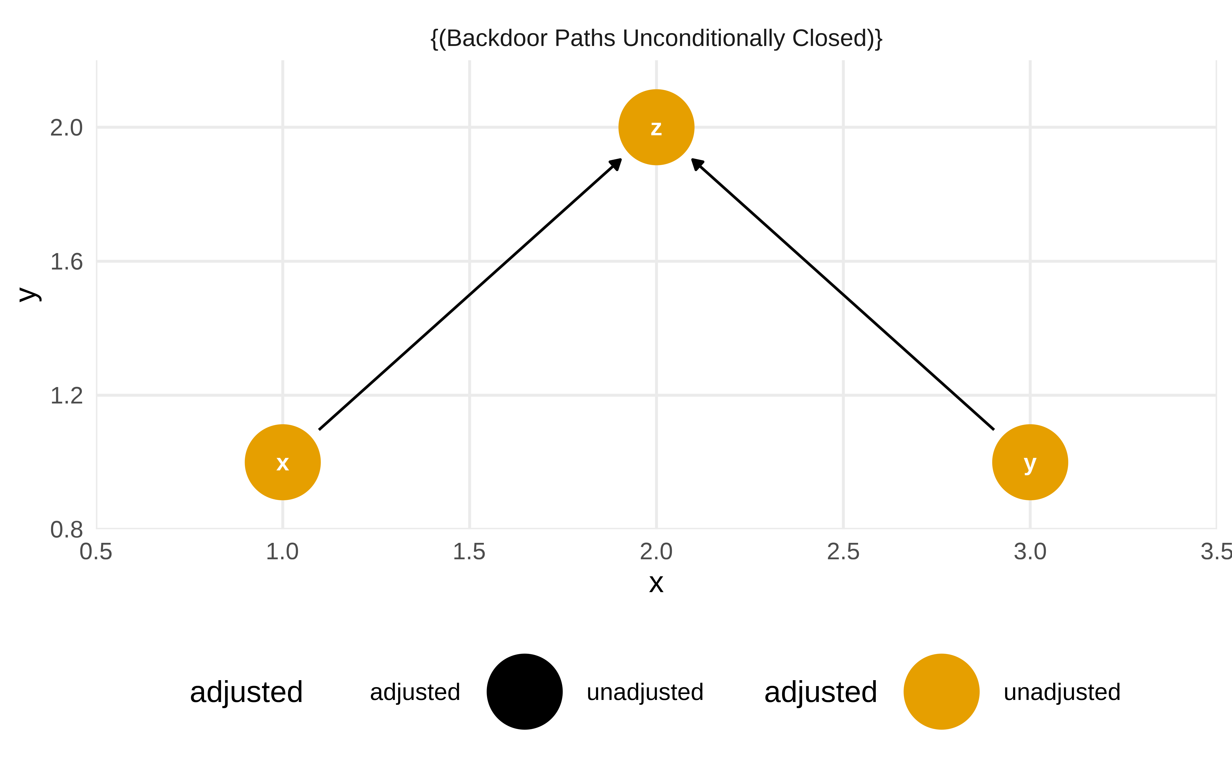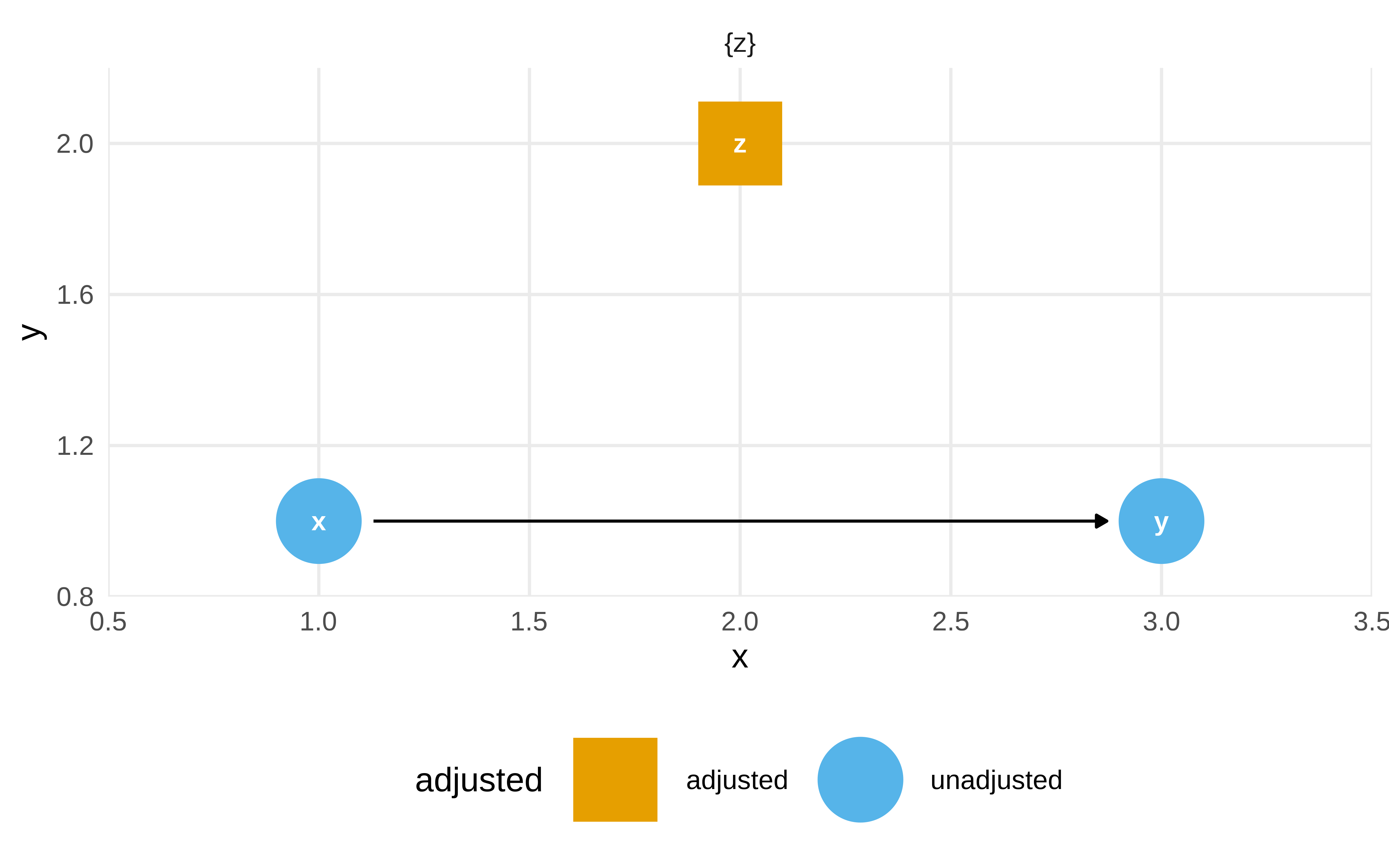 collider_dag<-dagify(z~x+y , coords =list( x =c( x =1, z =2, y =3), y =c( x =1, z =2, y =1)))#TODO poner las coordenadas de los nodosggdag(collider_dag)+theme_dag()