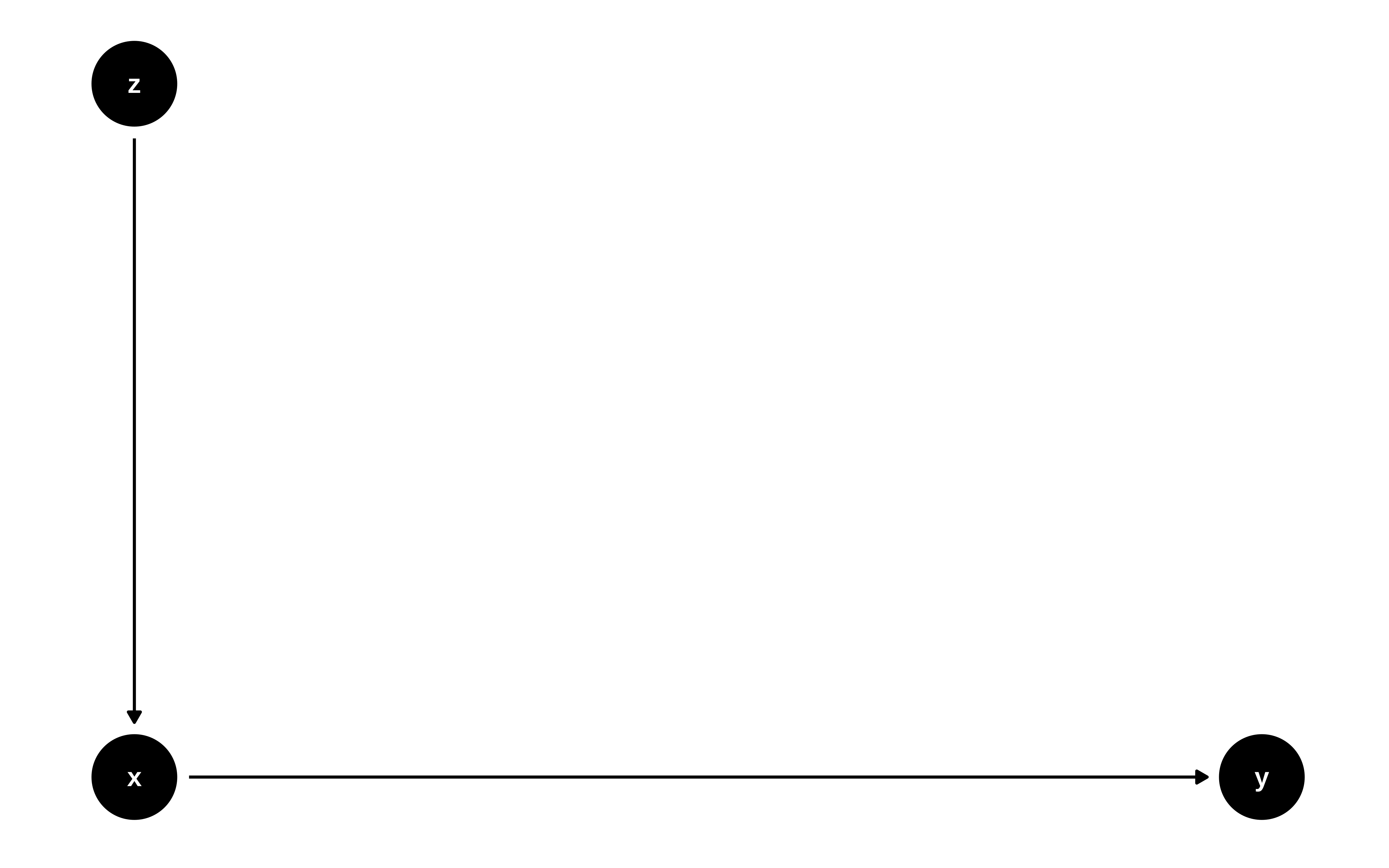 dag2<-dagify(x~z, y~x, coords =list( x =c( x =1, z =1, y =3), y =c( x =1, z =2, y =1)))#TODO poner las coordenadas de los nodosggdag(dag2)+theme_dag()