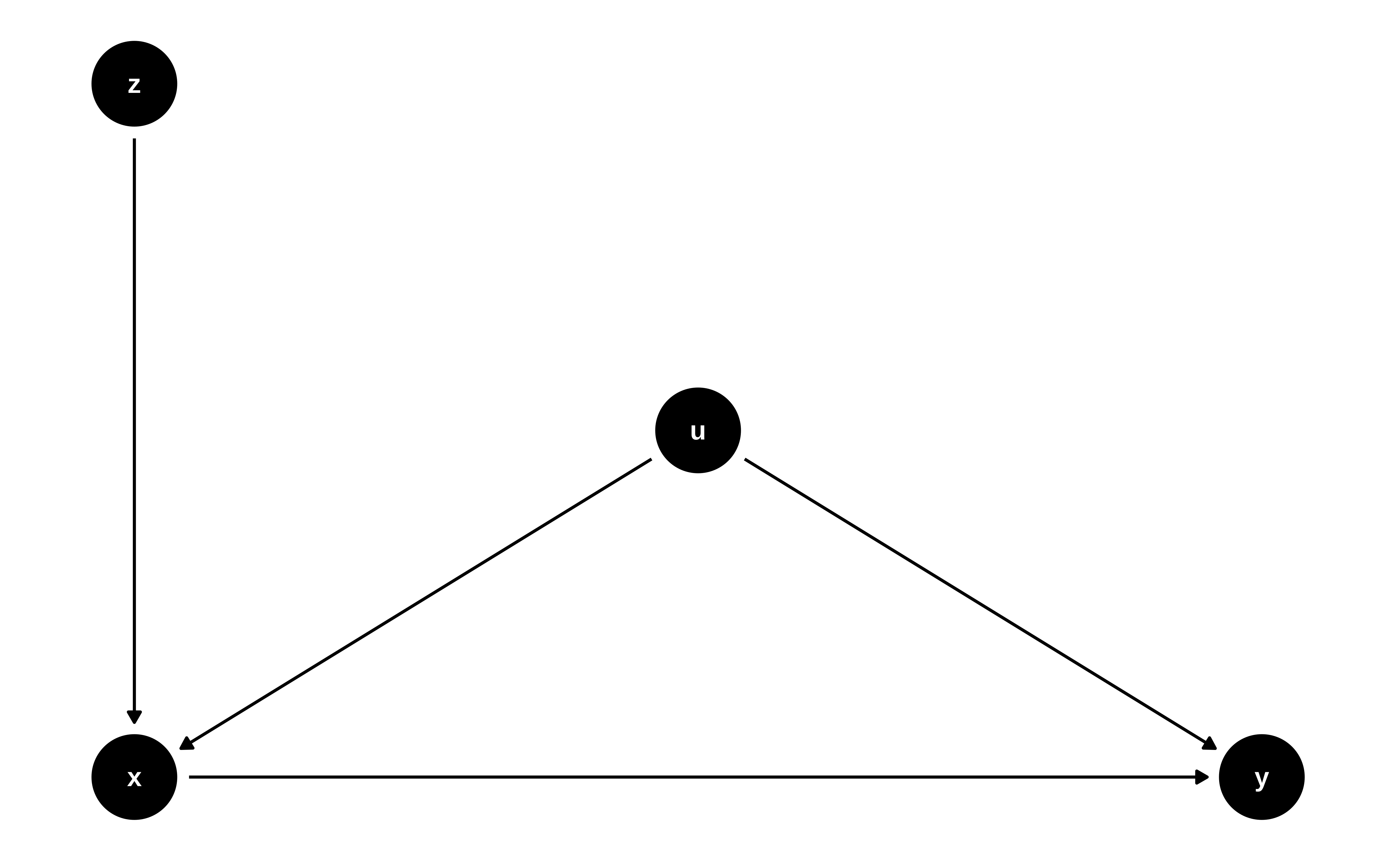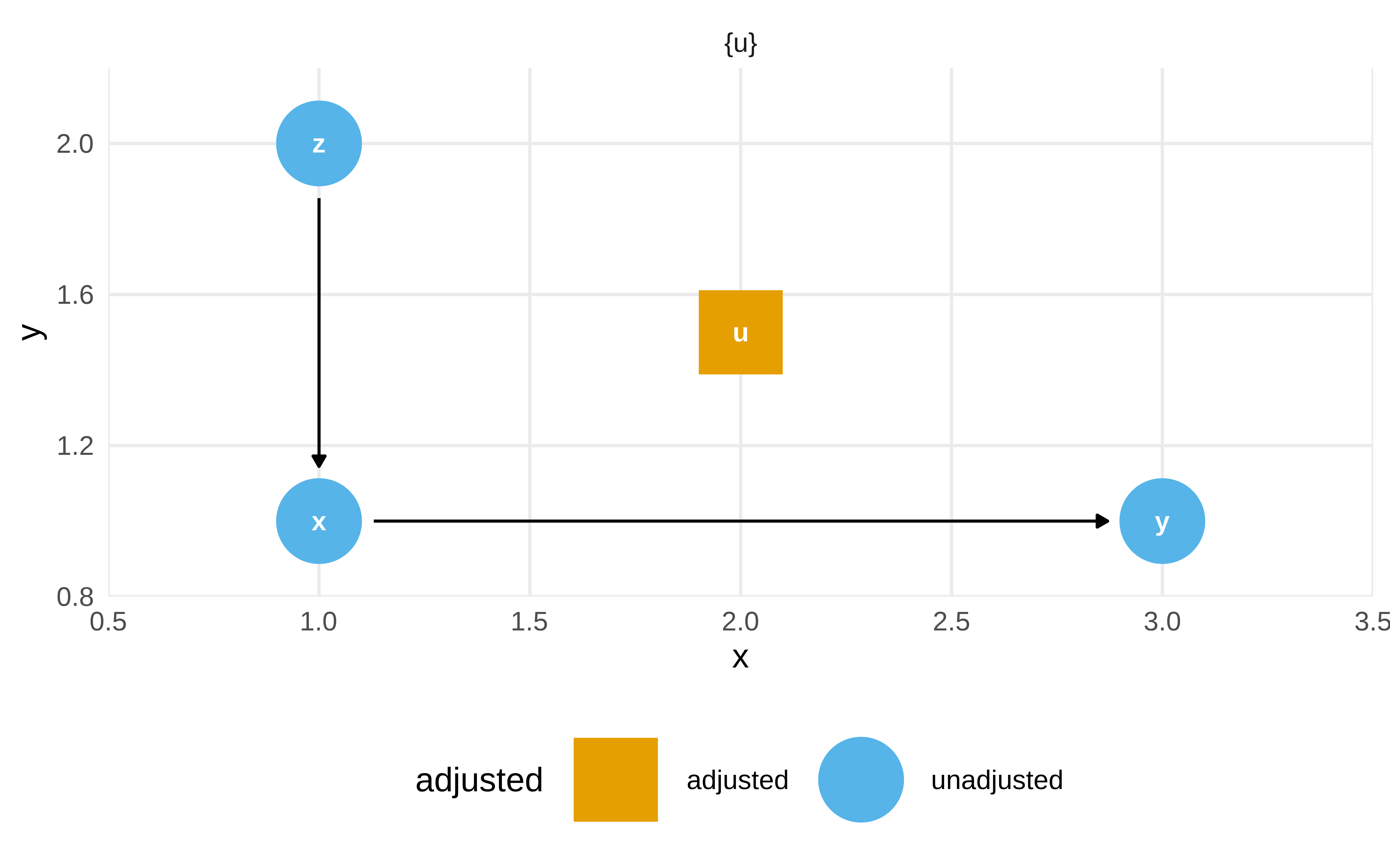 dag3<-dagify(x~z+u, y~x+u, coords =list( x =c( x =1, z =1, u =2, y =3), y =c( x =1, z =2, u =1.5, y =1)))#TODO poner las coordenadas de los nodosggdag(dag3)+theme_dag()