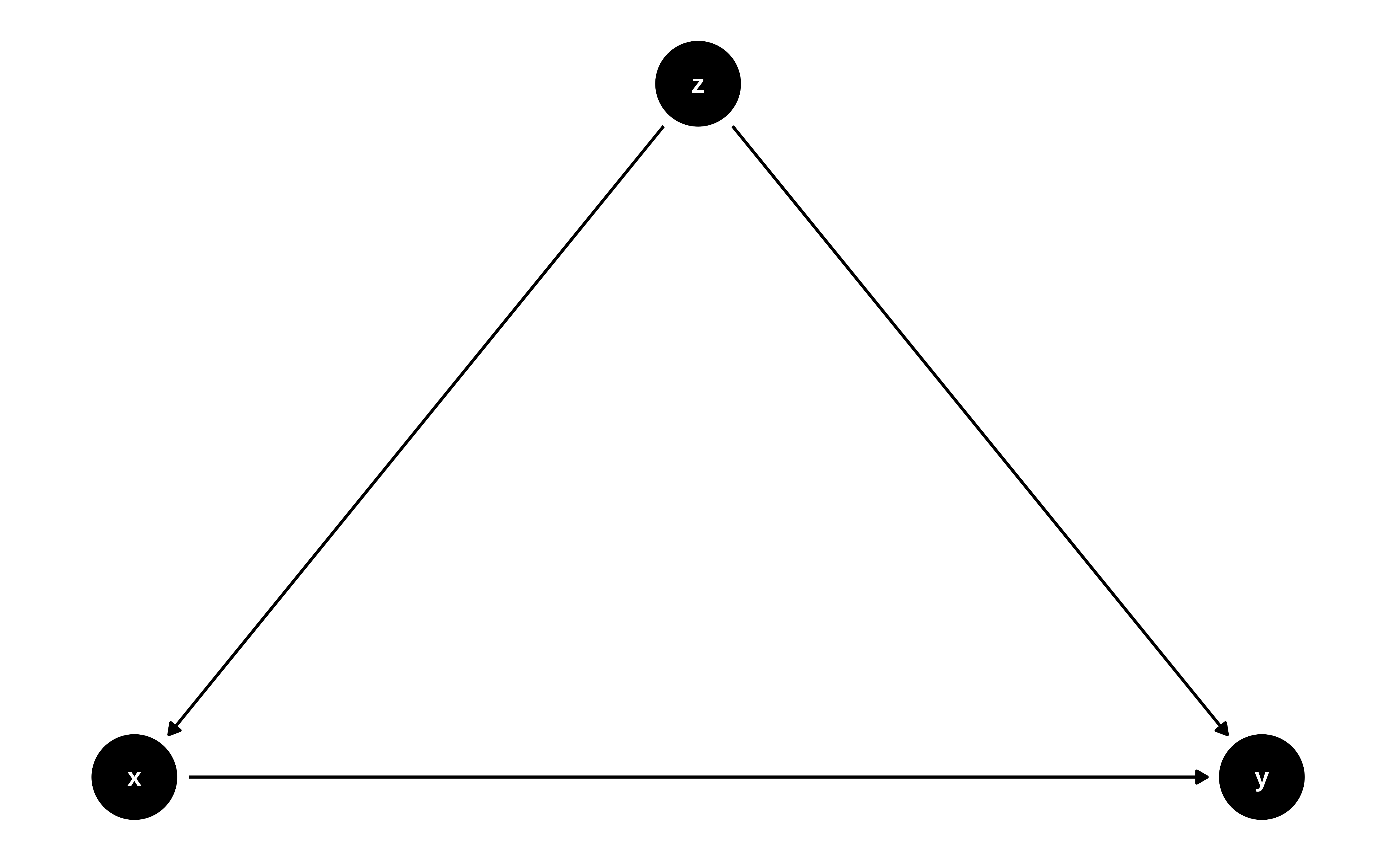Ponemos que el efecto total de x sobre y es 6, pero que está mediado sólo por z, y que el efecto directo de x sobre y es 0.